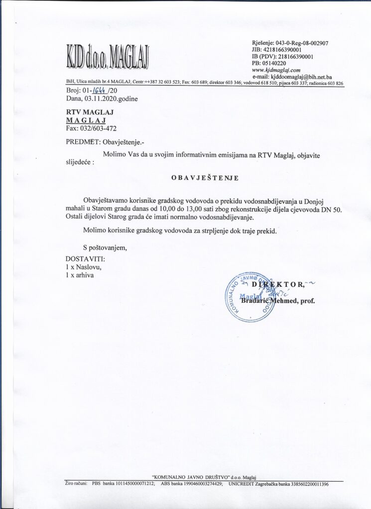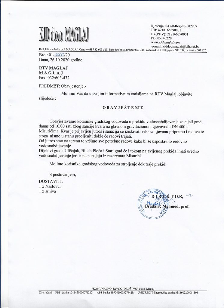 OBAVJEŠTENJE O PREKIDU USLUGE VODOSNABDIJEVANJA
