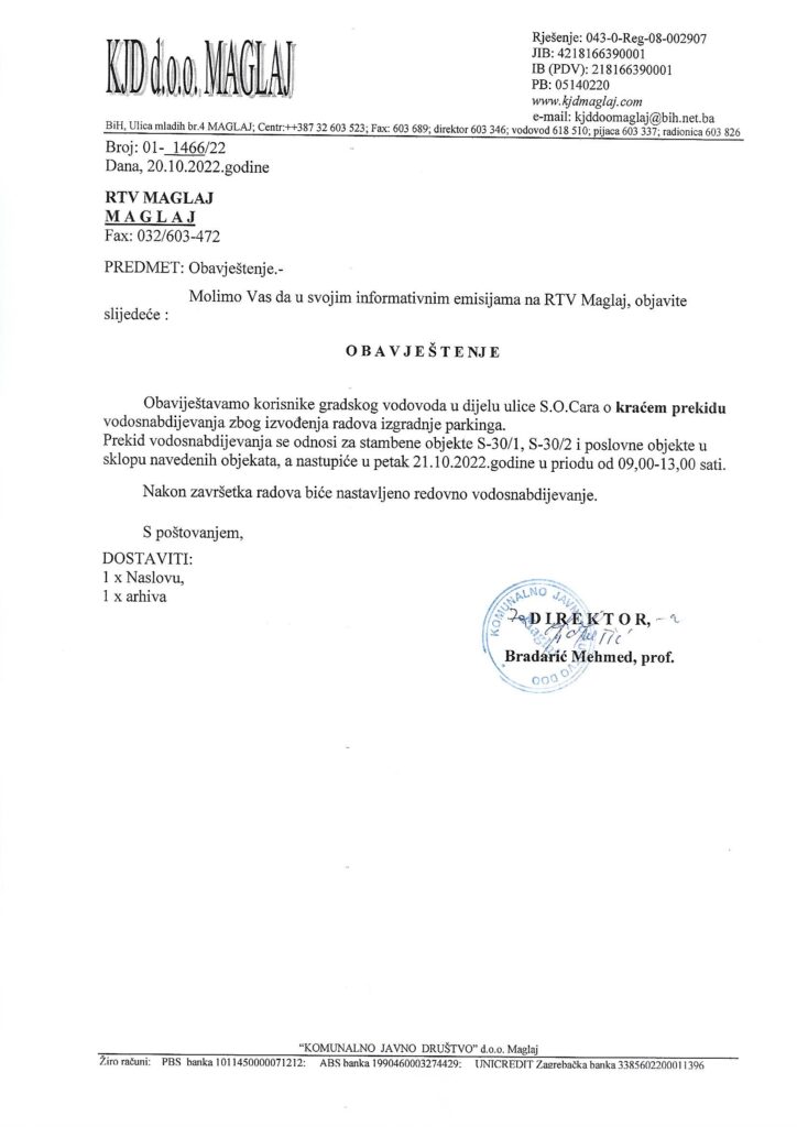 Prijava na javni oglas se podnosi na adresu: KJD d.o.o. Maglaj, Ulica mladih br. 4 Maglaj, u zatvorenoj