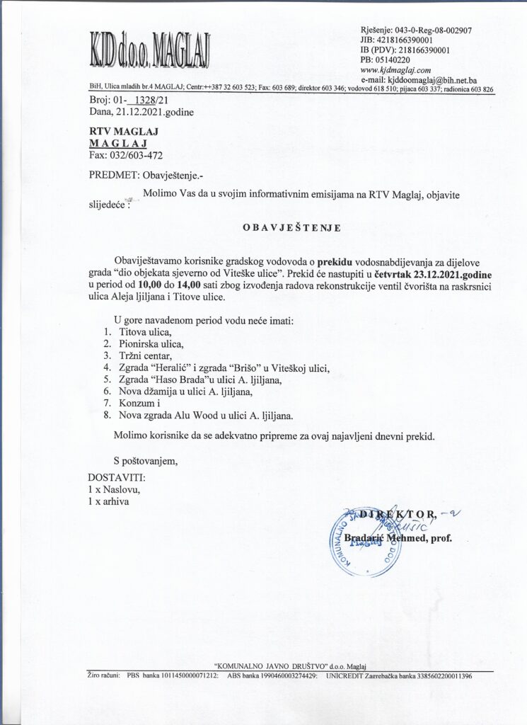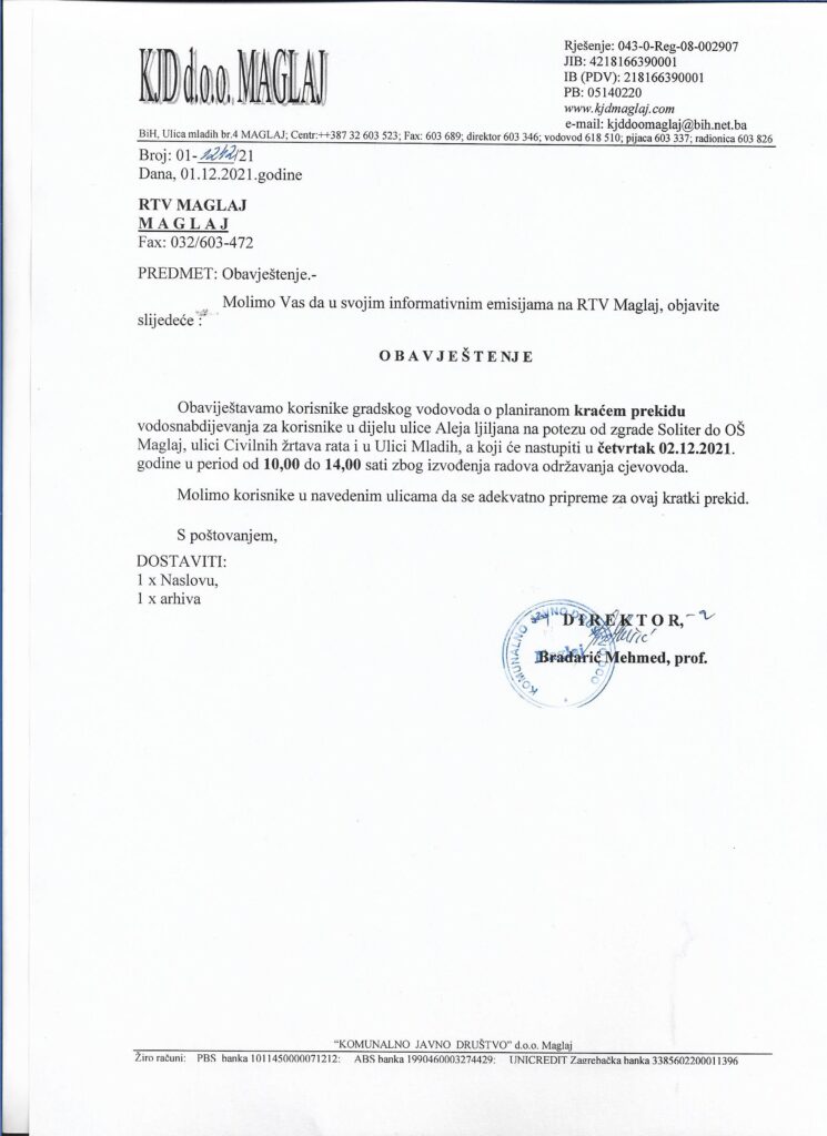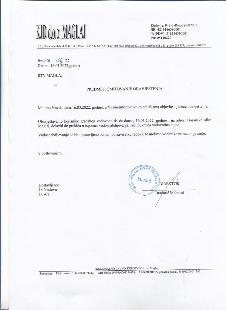 Prijava na javni oglas se podnosi na adresu: KJD d.o.o. Maglaj, Ulica mladih br. 4 Maglaj, u zatvorenoj koverti, sa naznakom: NE OTVARAJ – PRIJAVA NA JAVNI OGLAS“.