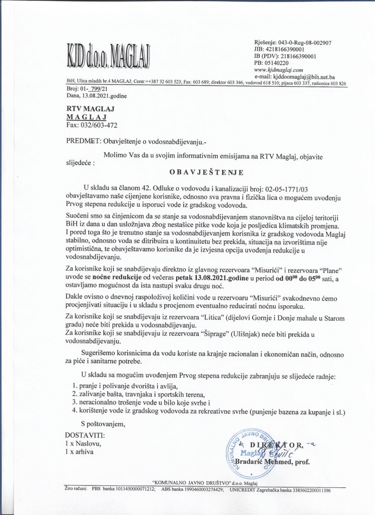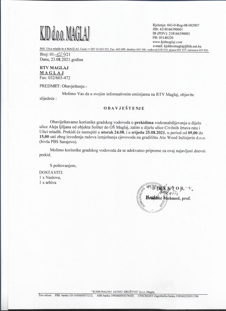Obavještavamo korisnike da će dana 04.08.2021. godine (srijeda) doći do kraćeg prekida vodosnabdijevanja za korisnike u dijelu ulice Aleja ljiljana od zgrade “Soliter” do OŠ Maglaj i u Ulici mladih,u periodu od 10,00 – 14,00 h, a zbog izvođenja radova izmještanja cjevovoda.