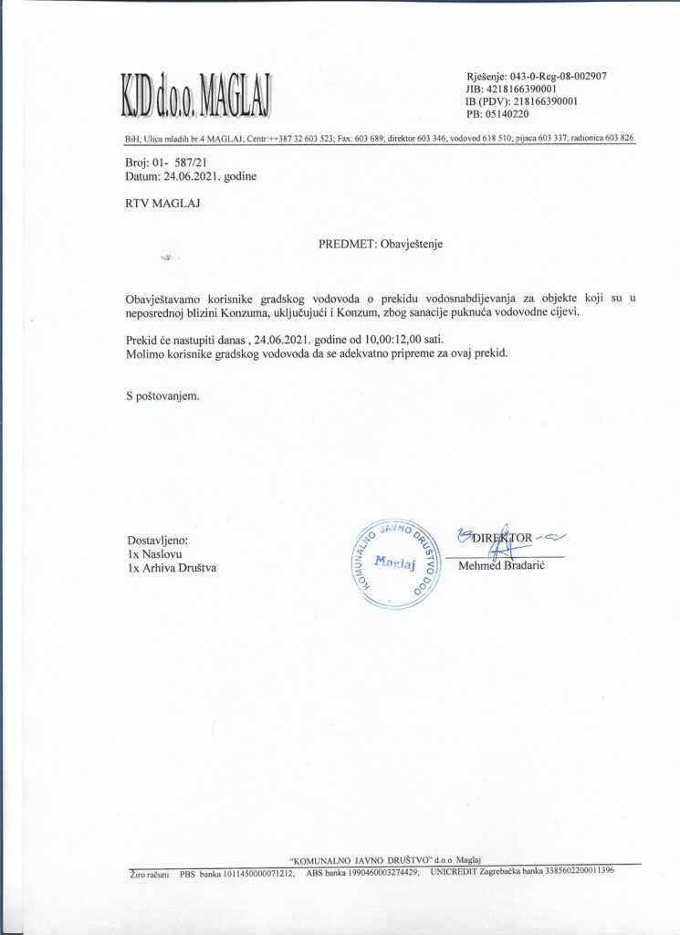 OBAVJEŠTENJE O PREKIDU USLUGE VODOSNABDIJEVANJA