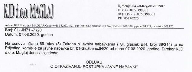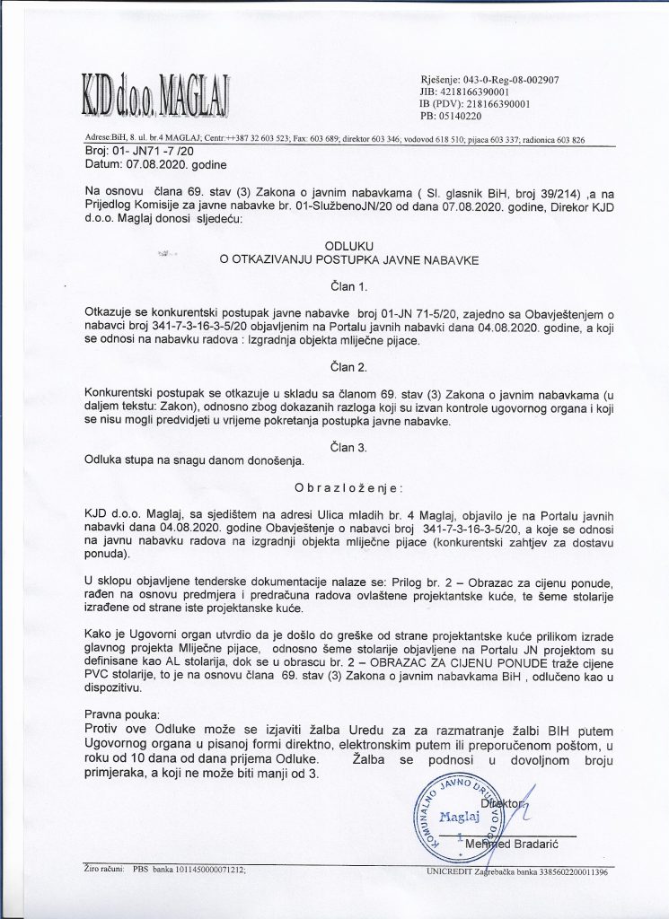 ODLUKA O OTKAZIVANJU POSTUPKA JAVNE NABAVKE – IZGRADNJA OBJEKTA MLIJEČNE PIJACE